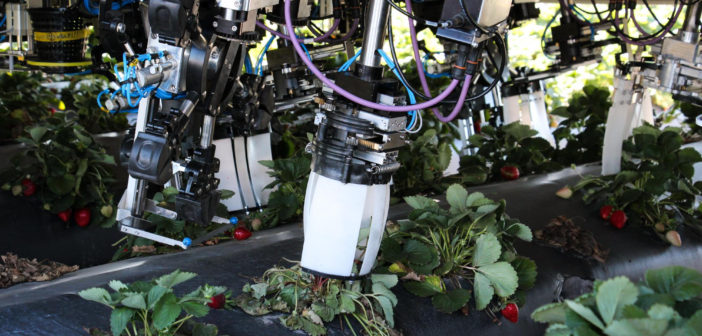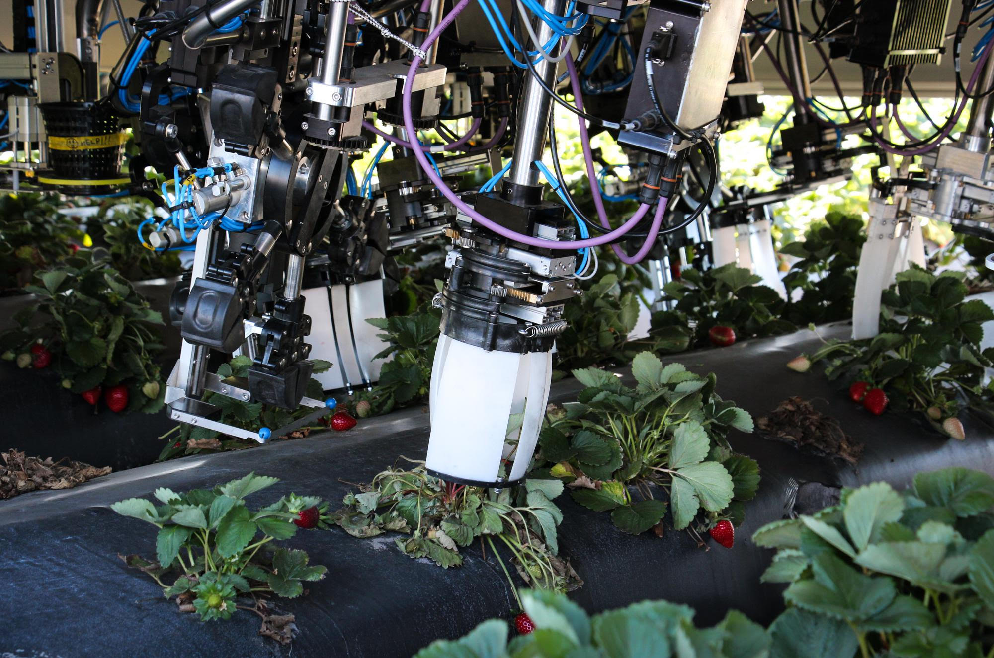 La ‘Berry Run’ testata da Harvest Croo Robotics è un macchinario appoggiato su ruote, in grado di trattare otto file di fragole alla volta attraverso l’impiego di 16 bracci robotici che sollevano le foglie del cespuglio, analizzano, con una camera laser, il grado di maturazione delle bacche (riconoscono il nero del telo per la pacciamatura, il verde della pianta e il rosso del giusto grado di maturazione), e poi raccolgono i frutti pronti con un morsetto di plastica per poi caricarli sul macchinario che ha una capacità di imballaggio di mille libbre (quasi 500 chili). Quello che si deve perfezionare è la capacità della macchina di distinguere il frutto maturo oltre che di saperlo manipolare con la dovuta delicatezza. Harvest Croo Robotics ci sta lavorando.