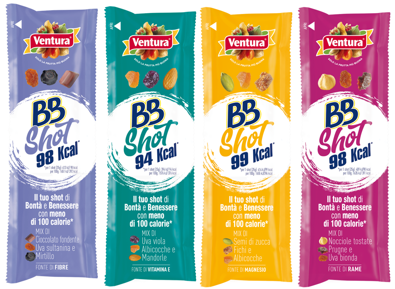Con BBShot, il mondo ‘BB – Bontà e Benessere Ventura’ che ha già visto il lancio, ad esempio, delle Bio barrette BB, diventa portavoce di un nuovo concetto legato alla frutta secca ed essiccata in risposta alle crescenti esigenze di consumo fuori casa di cibi sani e pratici, ideali per chi ha uno stile di vita dinamico: ben mixata e dosata, la frutta secca può rappresentare così uno snack salutistico più bilanciato e pratico in meno di 100kcal.