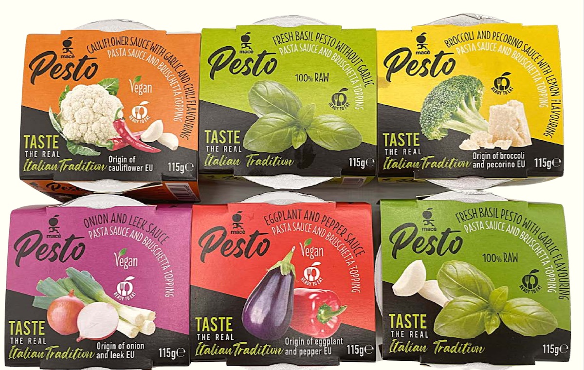 I pesti e le salse Macè sono disponibili in confezione da 115 grammi in 6 ricette: pesto fresco al basilico senza aglio; pesto fresco al basilico con aglio; salsa melanzane e peperoni; salsa broccoli, pecorino e limone; salsa cavolfiore, aglio e peperoncino e Salsa cipolle e porri. Sono previste confezioni più grandi anche per il canale Horeca.