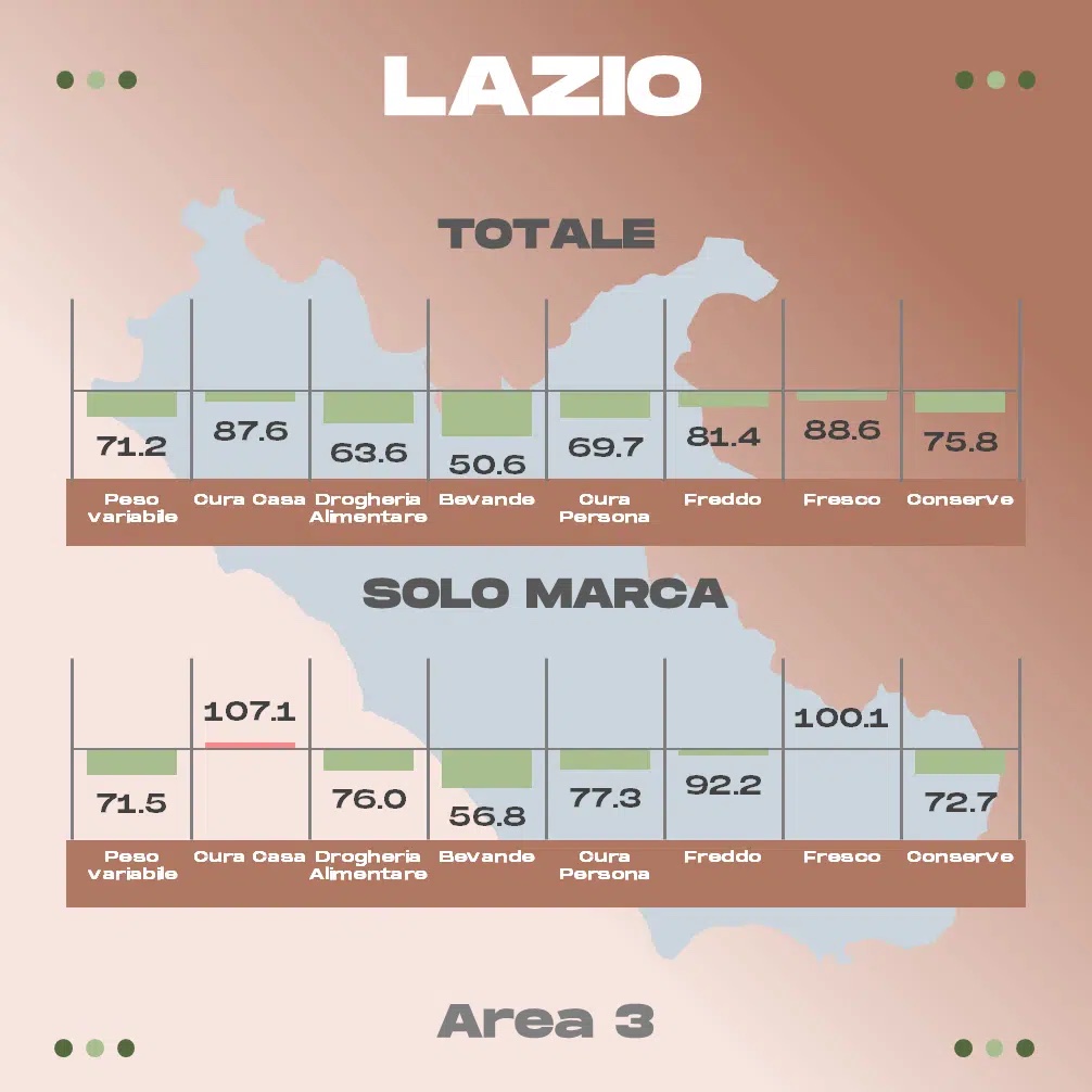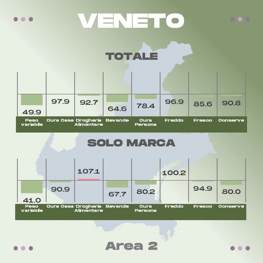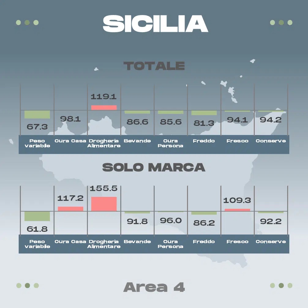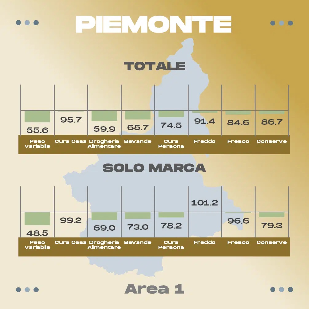 Ecco, sotto, le rilevazioni relative ad alcune delle principali regioni; le voci di interesse per fresh cut e surgelati sono la penultima e la terz’ultima (freddo e fresco).  Un valore inferiore a 100 indica che i discount sono più convenienti, viceversa che ad esserlo sono i volantini della GD “ISS”.