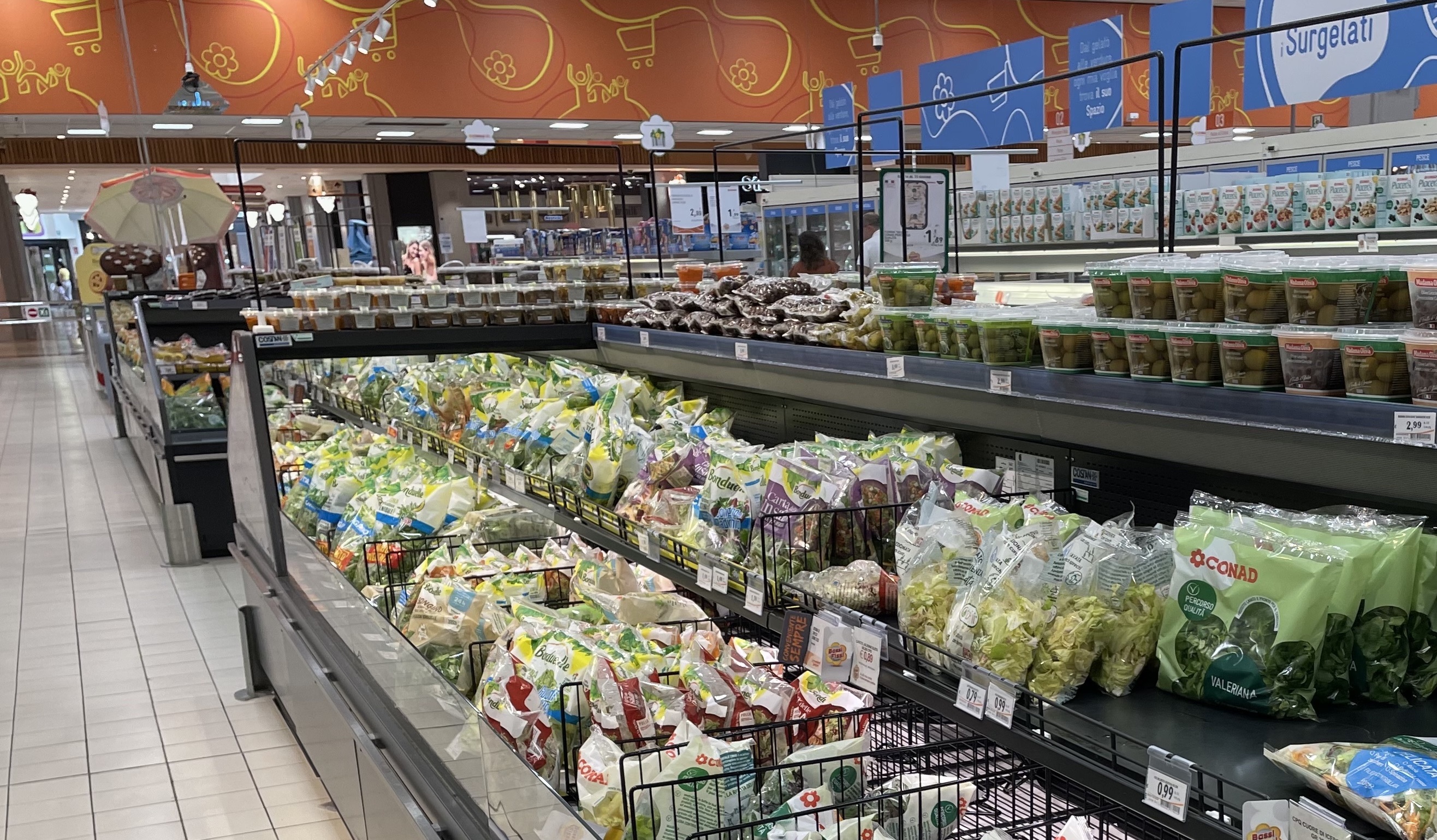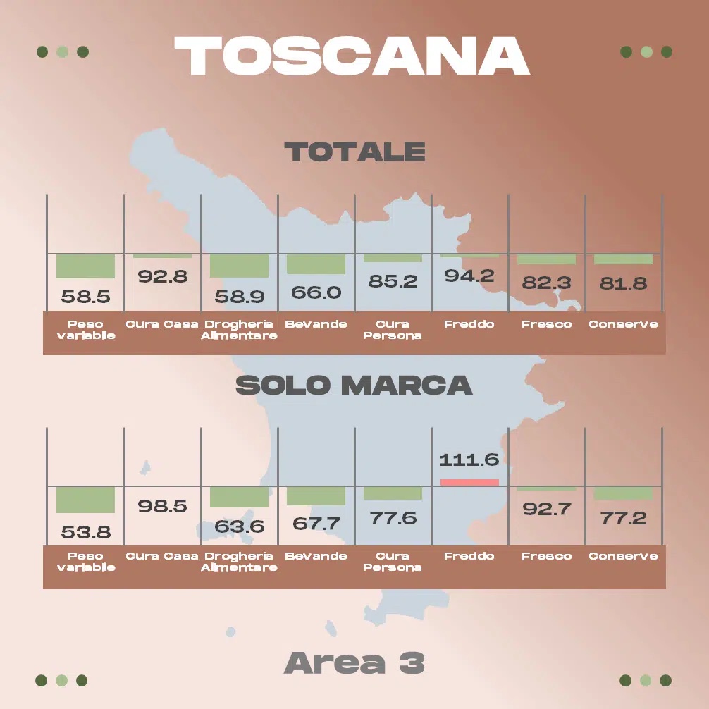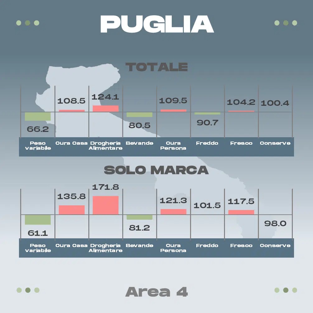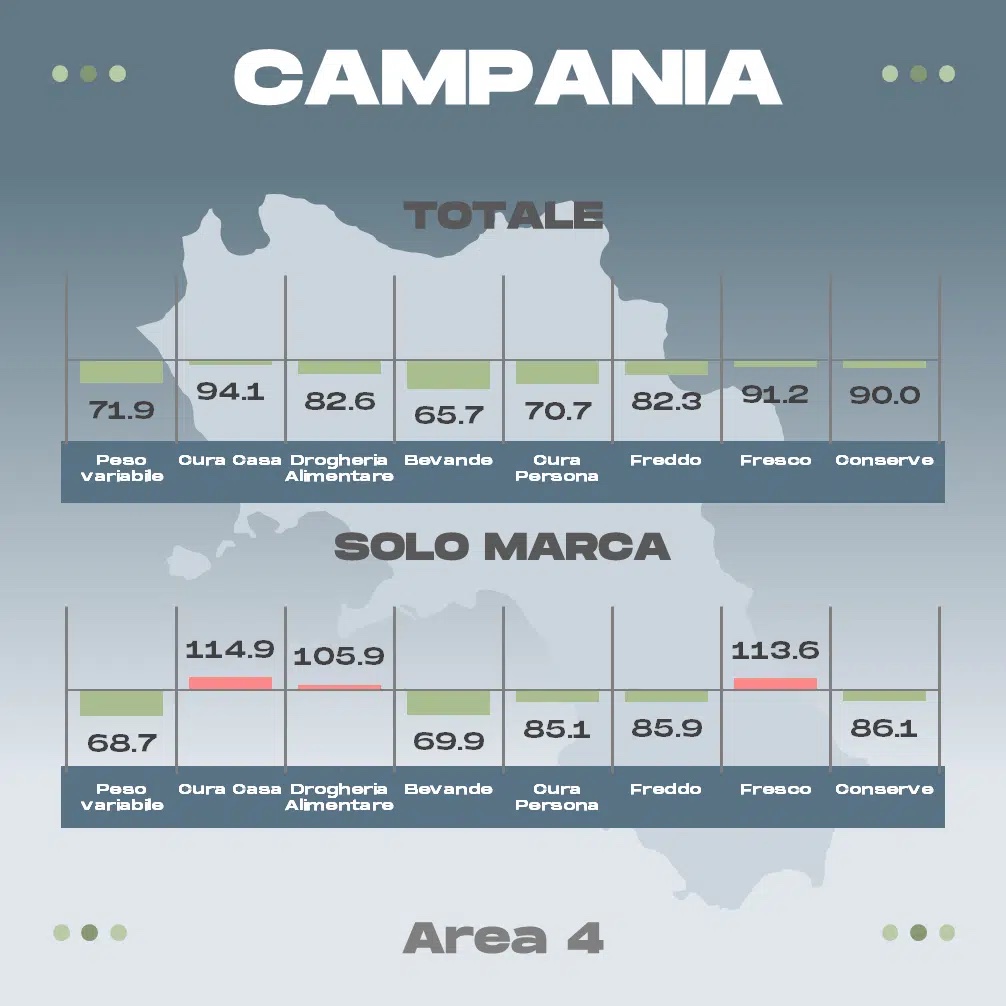 Ecco, sotto, le rilevazioni relative ad alcune delle principali regioni; le voci di interesse per fresh cut e surgelati sono la penultima e la terz’ultima (freddo e fresco).  Un valore inferiore a 100 indica che i discount sono più convenienti, viceversa che ad esserlo sono i volantini della GD “ISS”.