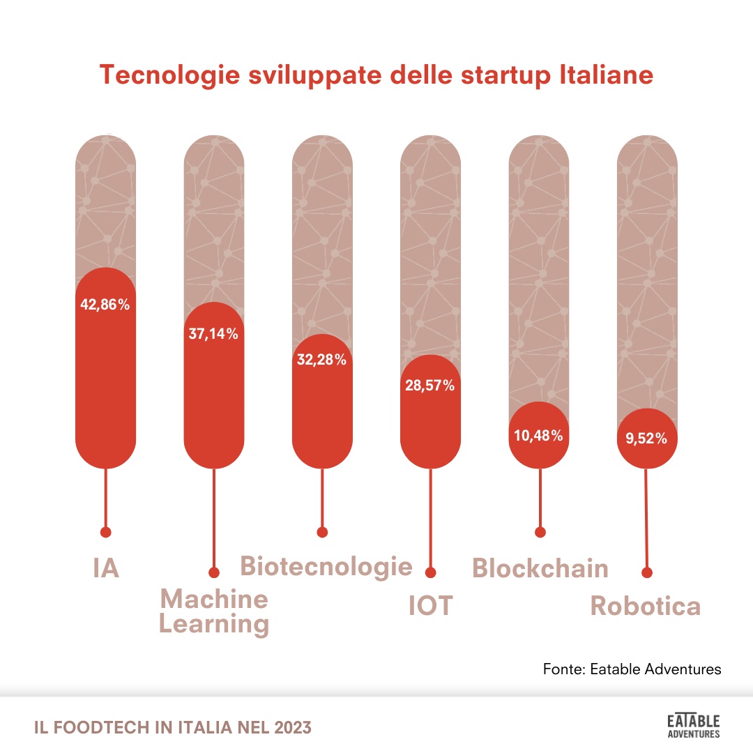 Guardando alle tecnologie più impiegate, l’intelligenza artificiale emerge come quella predominante, utilizzata dal 42,86% delle startup intervistate; seguono a ruota il machine learning, con un tasso di utilizzo del 37,14% e le biotecnologie con uno del 32,38%.